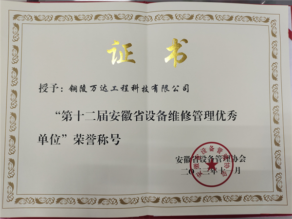 “第十二屆安徽省設(shè)備維修管理優(yōu)秀單位”榮譽(yù)稱號(hào)